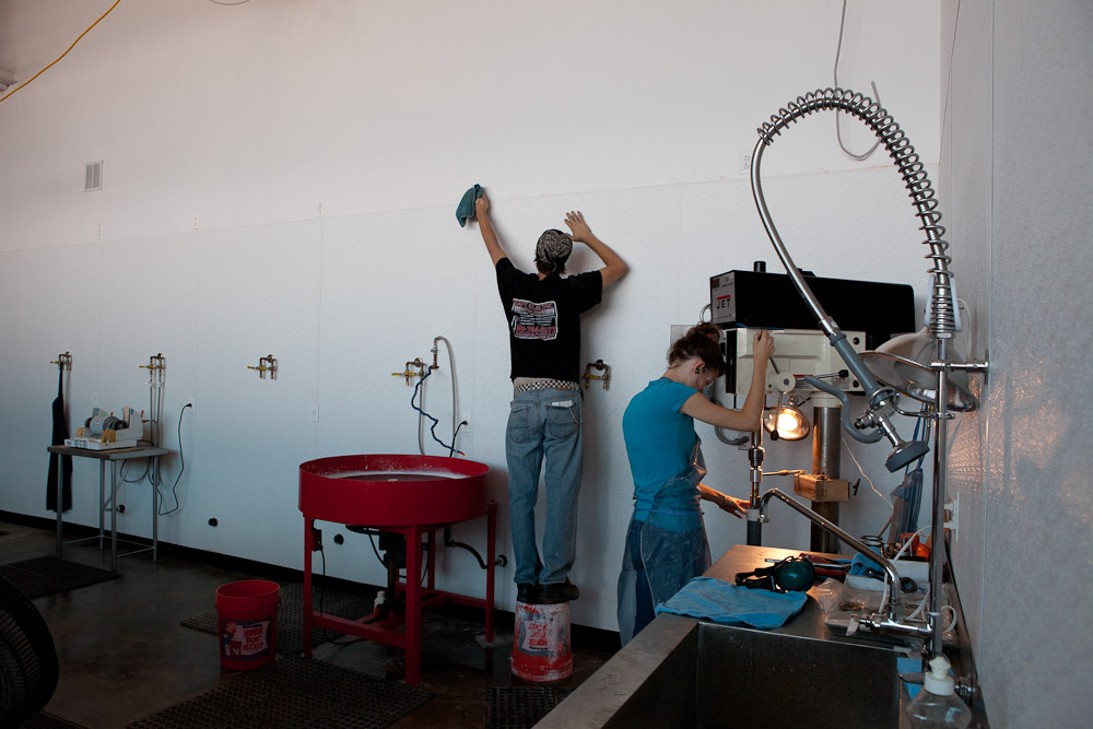 Annie maintains the focus of a true pro at the Niche Modern Cold Shop while Joe continues painting and adding the finishing touches to our new space. Next door at the future Niche Modern glass studio the mayhem of construction rattles on but the cold shop has been a much more zen and productive environment thanks to Annie and Allana's hard work!