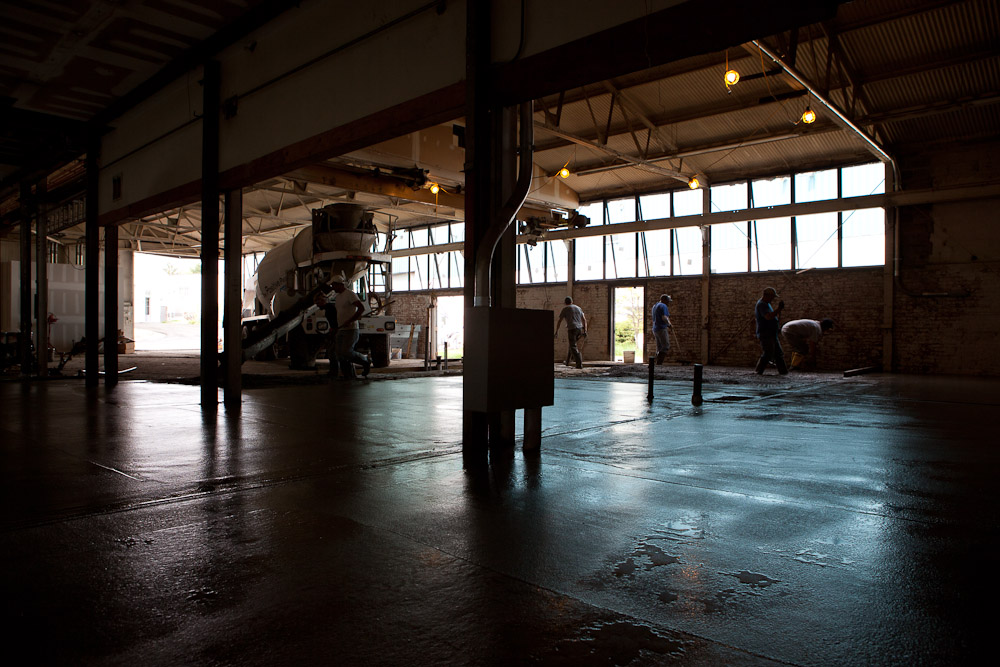 The week is over and the first pour of concrete for the future cold shop and hot shop at the Niche Modern glass studio is complete. At certain times of day, even up close, the concrete looks like water and you could almost imagine diving in. It will take a while to "cure" before heavy machinery is safe to drive on the floor but by next week Hal's team will begin framing some walls. We're on our way!
