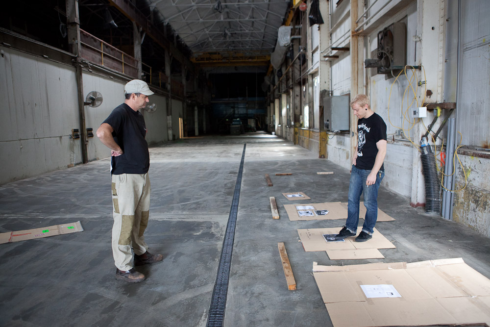 Adam spent a long time with us last week deciding where the equipment will go at the future Niche Modern Glass Studio. Every last detail is being considered: the path between the furnace and the annealer; the clearance on the glory hole doors... the more efficient and comfortable a studio is the more inspired and productive the team will be. By the end of June we hope to replace the cardboard placeholders with the real equipment! Here's hoping.