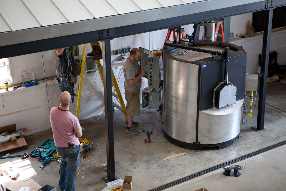 Jeremy, Zach and our amazing team of plumbers and electricians have been working hard all week to get the new 1,000 lbs furnace installed and hooked up to our gas lines at the future Niche Modern Glass Studio. This is a great perspective shot taken from the mezzanine at the end of a long day. The space is coming together and starting to feel like a real live glass studio!