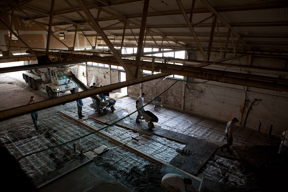 I don't know who was more excited this week when the giant concrete mixer headed down the drive: Jeremy or his 4 year old son?! I have to admit we all felt a little giddy by these first steps toward the final incarnation of our beloved studio. If you've ever lived through a renovation that involves the construction of a new floor you can understand that once the floor is in place, everything else starts to come together quickly. This was a BIG, exciting week for the Niche Modern glass studio construction.