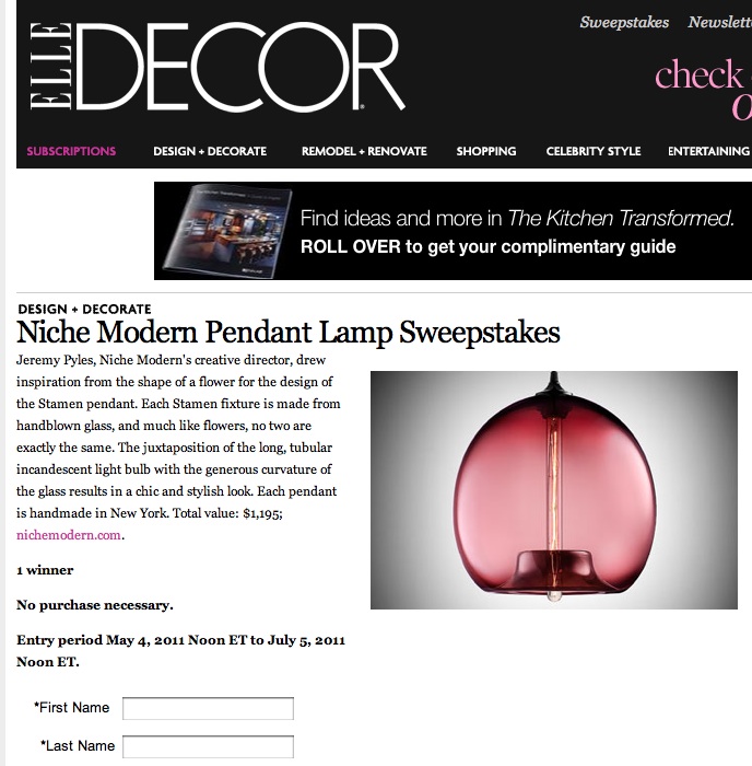 We figured we would start the countdown (someone has to!). Our signature Stamen Modern Pendant Light is up for grabs in its final days at the Elle Decor Sweepstakes, now through July 5th. The two-month sweepstakes will be wrapping up in 11 days and we'd love for one of our fans to grab hold of their very own Niche Modern Light. Have a few already? Why not one more? Can't bring yourself to buy one, yet? Maybe this one has been waiting for you! The Stamen is our first love, so we hold it in the highest regard. And, to whoever receives it, you bring home with it the essence of what Niche Modern is all about. Best of luck to all!