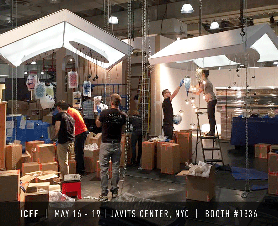 Wow, what a wild week it has been! We're nearly all set up for the start of ICFF tomorrow! Be the first to see our new, colorful hand-blown glass lighting, the Helio Series and the Pointelle Series. Your eyes are in for a real treat!