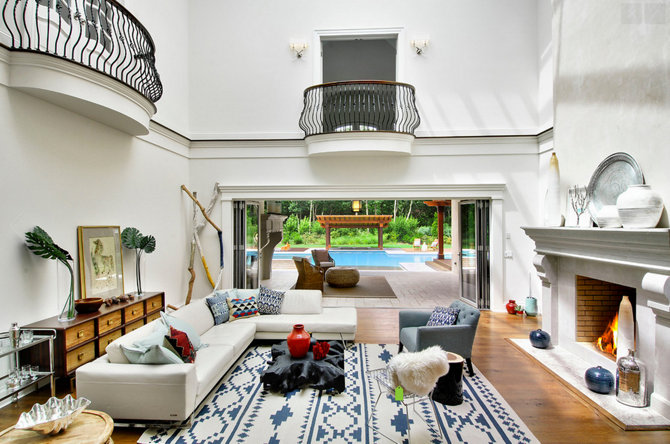 With a large emphasis on outdoor living, the common room and patio area leading to the pool are seamlessly combined with large glass doors, hardwood flooring, and Southwestern-inspired motifs.