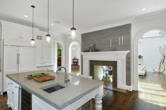 Amongst the multiple balconies, skylights and fireplaces, our Minaret Pendants in Crystal find their place in the serenity of the kitchen. The bright white walls are balanced with the light gray marble countertops and wall paneling. Sunlight pours in from all sides, dancing between floor, counter and our glistening pendants.