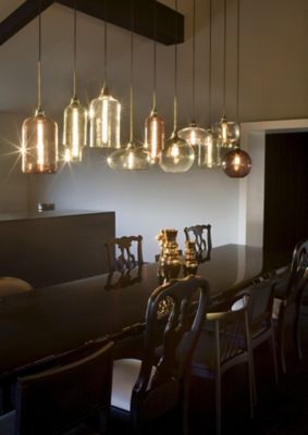 A cluster of Niche pendants hang above a tasting table at Merus. The grouping features our Aurora, Bella, Oculo, Pharos, Pod and Solitaire modern pendant light. Hanging from varying drop lengths, these pendants create a stunning and unique fixture, making this the perfect centerpiece to impress the winery's guests. Niche Plum, Crystal, and Smoke colored glass is featured in the arrangement, evoking the image of red and white wine.