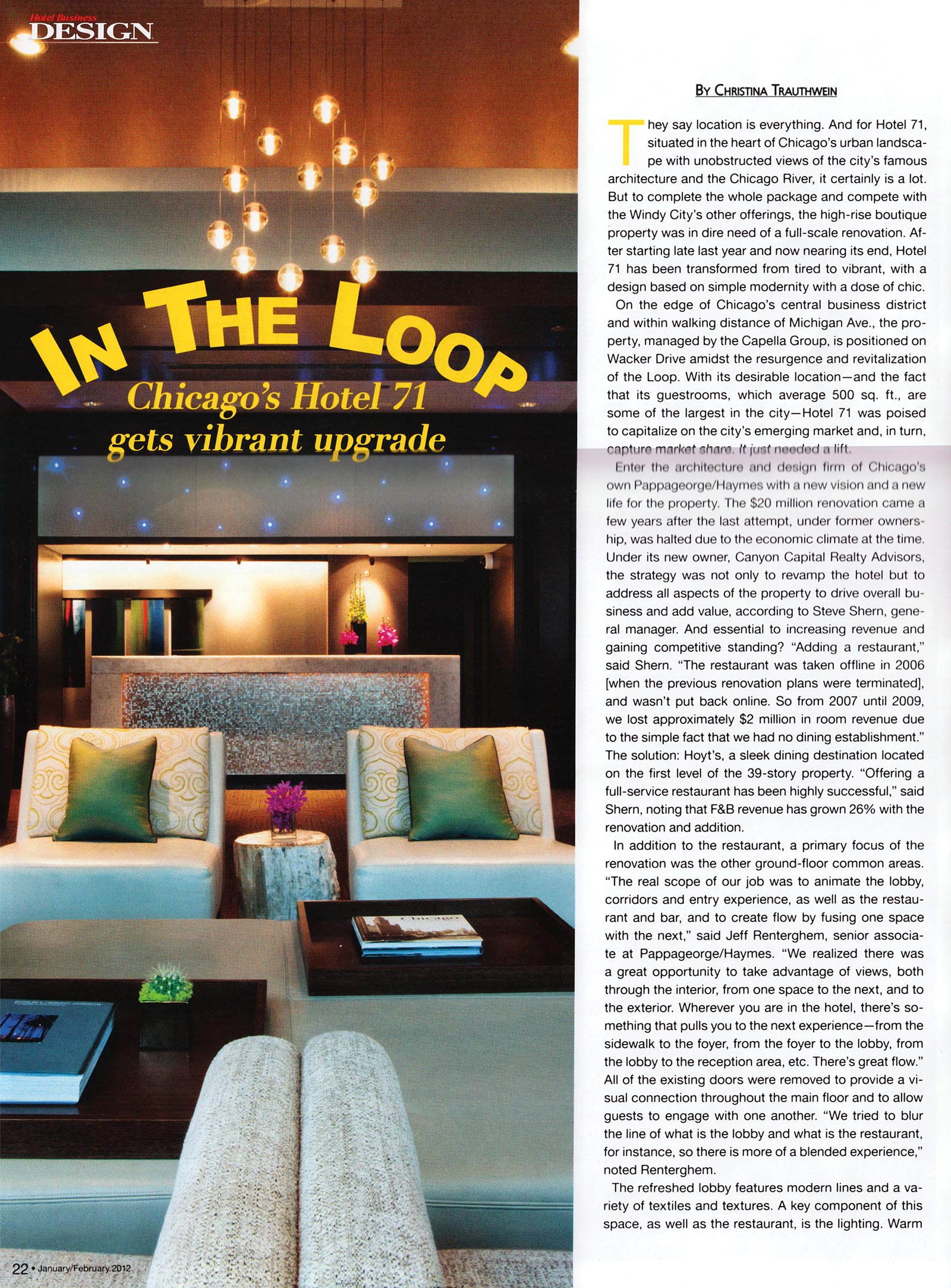 A Chicago hotel renovation is featured in the January/February edition of Hotel Business Design. Hotel 71, a boutique luxury hotel on Wacker Drive in the heart of Chicago, experienced a full revamp by Chicago design firm Pappageorge/Haymes from 2009 through 2011. The space looks splendid! We were excited to see our Pod and Bell-Jar Pendant Lights included in the chic new restaurant, Hoyt's, which was included in the renovation. You can see some more images of the wonderful new space here.