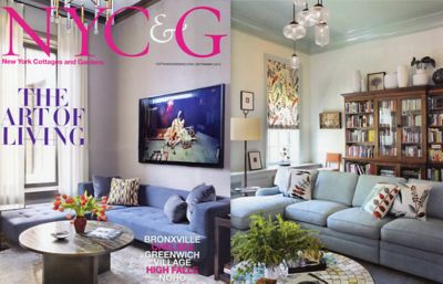 Modern comfort and exquisite detailing coexist within this West Village townhome designed by Amy Lau designs. Colorful throw pillows, artful walls, and ceramic vessels add unique elements of homeyness and individuality to the space. New York Cottages and Gardens captured the centerpiece of the living room, a cluster of our Minaret and Turret pendants in Effervescent. This dazzling installation of living room pendant lighting really brings a refined touch to the relaxed atmosphere.