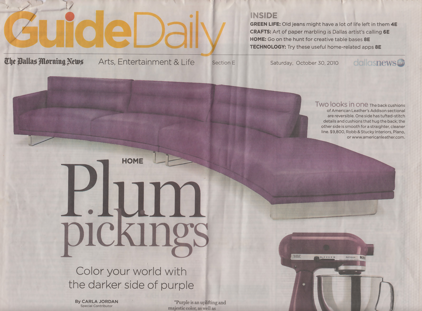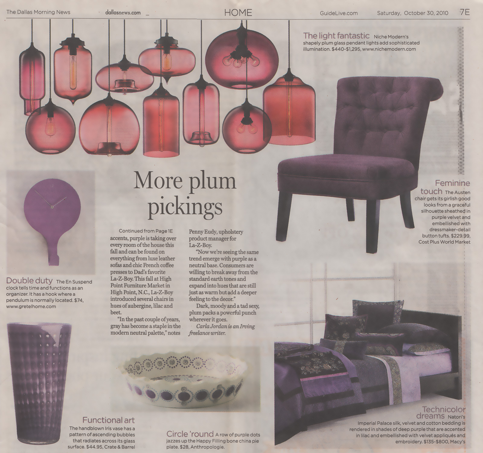 What does a clock, a handblown vase, a china pie plate, silk bedding, a couple chairs, a KitchenAid mixer, Bodum French press, cast iron French oven, a few Niche Modern Pendant Lights, and a sectional couch all have in common?? Nothing really, objectively speaking. Well, one thing for sure... they are all made available in some hue of purple. The Dallas Morning News ran a feature titled "Plum Pickings" last year and included our plum pendant lights among the other functional objects listed above, all brilliantly sporting some shade of purple. The article called purple "the hot new color in home decor." It wasn't the first time we heard the rumor. In August of last year, Residential Lighting magazine featured our Solitaire in Plum on their front cover, blogger Kim Vallée noticed Plum trending last year, and including a few of our pendants, Martha Stewart magazine shared ideas on decorating with dark colors. It's truly a remarkable color, composed of both blue and red and has an extremely rich history, associated with royalty and nobility. For more on the brilliance of purple, click here to read more.