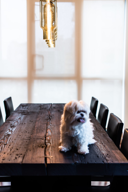 This stunning dining room renovation completed by interior designer Gaile Guevara is contemporary and inviting. The large natural wood and stain finished farm-house dining room table adds a rustic and earthly tone to the ivory walls. The dark chocolate chairs placed around the dining room farm-house table adds a touch of softness to the angular sides of the table. Part of a large 1065 sq.ft loft apartment in Vancouver, this dining room is contemporary and chic.