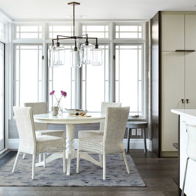 This modern white kitchen in Toronto, Canada redefines the term industrial. Stainless steel, pearly white, and deep browns create a bold and elegant color scheme. The windows face south-west, allowing ample light to flood into the kitchen table and reflect off of the cream colored breakfast table.