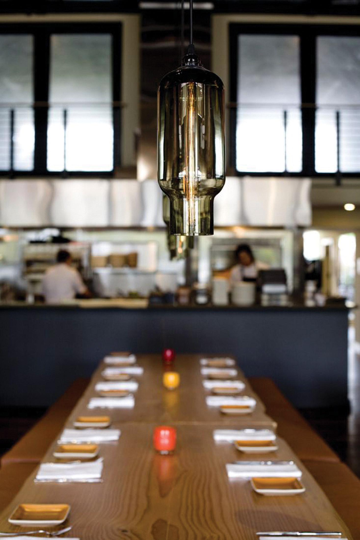 Pharos modern pendants accent the mix of colors and textures featured inside Ubuntu restaurant.