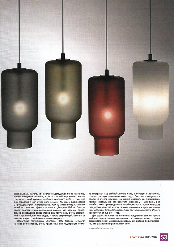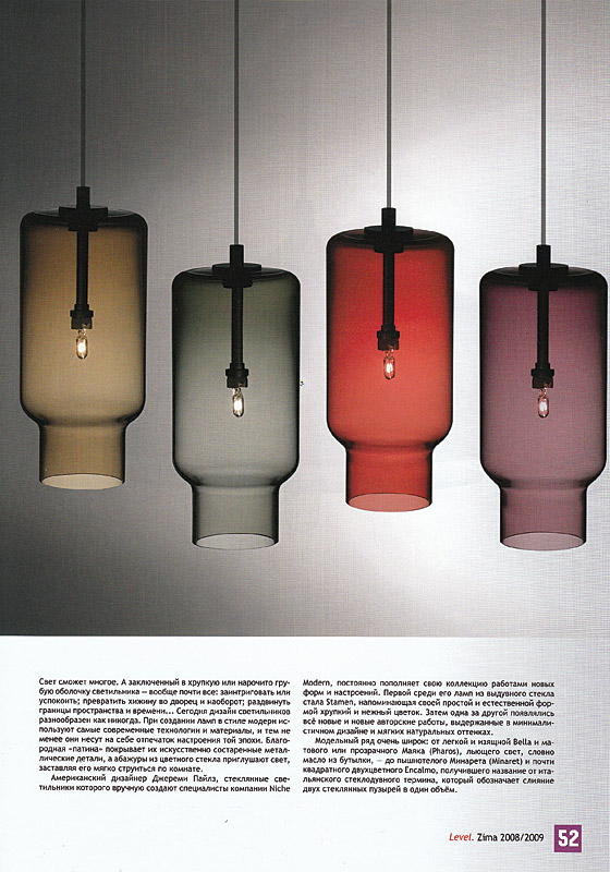Level magazine showcases our many glass colors in their 2008/2009 spread of the Aurora and Phaeton pendants. The Pharos pendants share a very similar silhouette with the Phaeton.