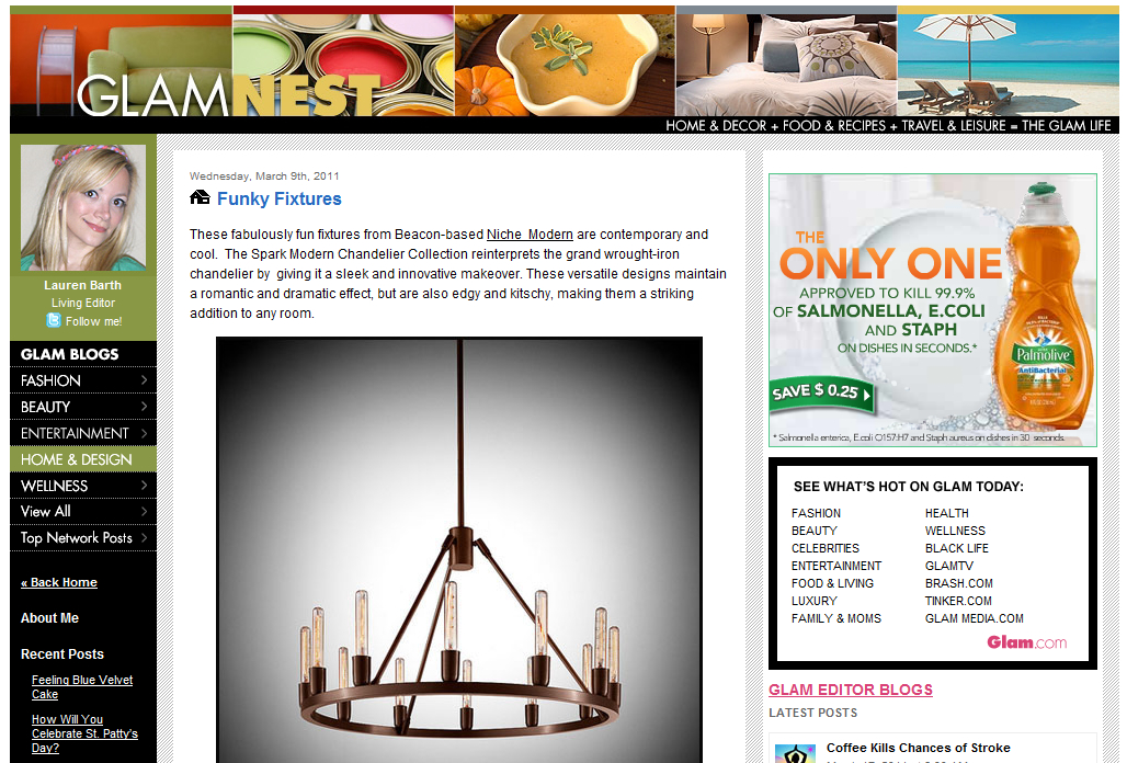 In a Glam.com blog post this month, our Spark Modern Chandelier was graciously featured for it's funkiness and versatility while maintaining "a romantic and dramatic effect."